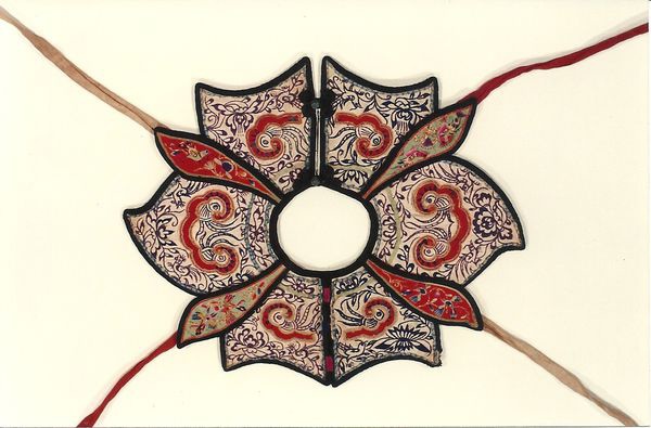 三、"無獨有偶",這種公雞頭的圖案,不是只有在童帽上,也同時在其它的繡件上,台灣民間的雲肩、劍帶、肚兜等,也常見這成對公雞頭,有的雖然沒有加上雞冠,但還是很明顯的看出是雞頭,而不是老鷹。最常見的形式,就是和如意雲頭結合,利用雲頭紋尾端的弧度,變成公雞頭,有(公鳴)「功名如意」的寓意。