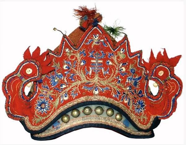 (圖一) 這頂童帽是北投文物館的精品收藏之一,距今約100年了,繡線仍然光亮如新。這種形式的帽子,多年來一直被稱為“鴟鴞帽”,但實在是不正確的,雖然乍看之下,這對鳥頭,沒有雞冠。但是很清楚可看得出,鳥頭的頸部有五彩的羽毛,旁邊有隻小公雞,正中間有朵大牡丹,代表著(公鳴)功名富貴的意思。應該是一對大公雞頭。