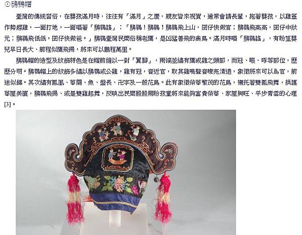 鴟鴞帽-貓頭鷹+老鷹/恢復“公雞帽”或以台語或客語發音的“雞公帽”為稱呼/台中東勢客家的童帽。帽子前面兩端的鳥頭,上面有紅色的雞冠+這頂北部客家的童帽,雞頭上沒有雞冠。不過正中間 仍是繡有一對公雞和牡丹花。這種造型的帽子,更像戲曲裡小生的帽子+帽子前面兩側上揚的“鳥頭”,實際上應該是公雞頭(見後述)。之所以被誤名為“鴟鴞帽”,是因為在早期台灣傳統禮俗中,嬰兒滿月時,有喊鴟鴞(老鷹)爲嬰兒祈福的儀式。 〈滿月喊鴟鴞〉。/鳥頭的頸部有五彩的羽毛,旁邊有隻小公雞,正中間有朵大牡丹,代表著(公鳴)功名富貴的意思/公雞和雞冠花在一起有(冠)官上加官(冠)的寓意。和牡丹花在一起有富貴大吉或是(公鳴)功名富貴的意思。中國古代特別重視雞,稱它為『五德之禽』,/《韓詩外傳》說,它頭上有冠,是文德;足後有距能鬥,是武德;敵前敢拼,是勇德;有食物招呼同類,是仁德;守夜不失時,天明報曉,是信德。民間更將雞視為吉祥物,說它可以避邪,還可以吃掉各種毒蟲,為人類除害。公雞在民間刺繡上面是常見的圖案。/:鴟鴞帽後來也出現公鷄的造型,除了冠帽上的公鷄紋樣,連兩端鴟鴞也變成頂著紅色肉冠的公鷄造型。鮮紅的帽冠,喜氣洋洋,也隱涵「冠上加冠」之含意。 @ 姜朝鳳宗族 :: 痞客邦 :: http://bit.ly/2V5HHtM