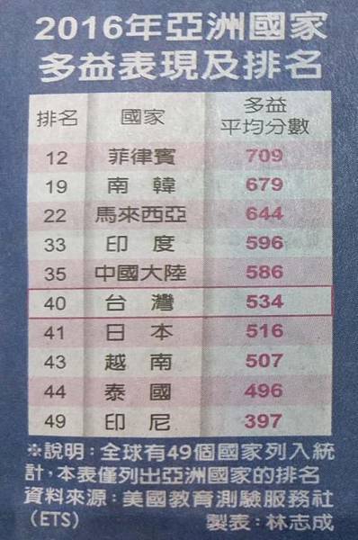 教育部今公布2015年亞洲托福成績排名,台灣在亞洲30國中排12名,8年內進步6名、8分,進步幅度只輸給越南,高過亞洲其他國家。