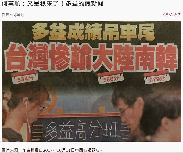 國慶日的隔天,中國時報的頭版頭條,居然不是對蔡英文國慶文告的冷嘲熱諷,而是一條多益的假新聞:「多益成績吊車尾 台灣慘輸大陸南韓」。