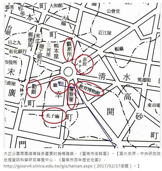 大正公園周圍繞著諸多重要的機構建築。《臺南市街略圖》。【圖片來源:中央研究院地理資訊科學研究專題中心,《臺南市百年歷史地圖》,http://gissrv4.sinica.edu.tw/gis/tainan.aspx(2017/02/17瀏覽)。】