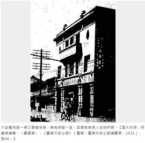 六安醫院是一棟三層樓洋房,兼有病室一座,因應急患病人住院所需。【圖片來源:柯萬榮編著,〈黃國棟〉,《臺南州名士錄》(臺南:臺南州名士錄編纂局,1931),頁46。】