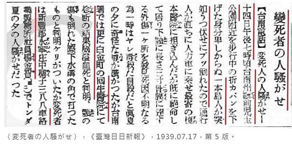 〈変死者の人騒がせ〉,《臺灣日日新報》,1939.07.17,第 5 版。