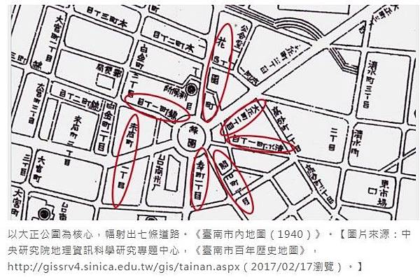 以大正公園為核心,幅射出七條道路。《臺南市內地圖(1940)》。【圖片來源:中央研究院地理資訊科學研究專題中心,《臺南市百年歷史地圖》,http://gissrv4.sinica.edu.tw/gis/tainan.aspx(2017/02/17瀏覽)。】