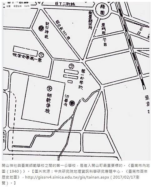 開山神社與臺南師範學校之間的第一公學校,是進入開山町最重要標的。《臺南市內地圖(1940)》。【圖片來源:中央研究院地理資訊科學研究專題中心,《臺南市百年歷史地圖》,http://gissrv4.sinica.edu.tw/gis/tainan.aspx(2017/02/17瀏覽)。】