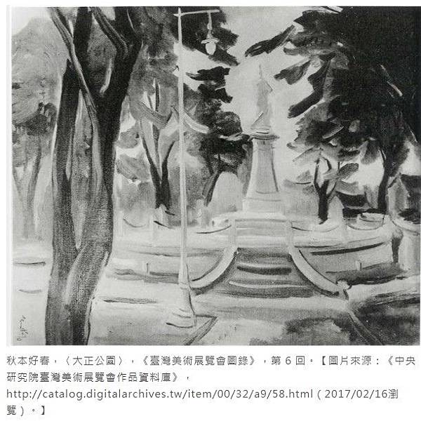 秋本好春,〈大正公園〉,《臺灣美術展覽會圖錄》,第 6 回。【圖片來源:《中央研究院臺灣美術展覽會作品資料庫》,http://catalog.digitalarchives.tw/item/00/32/a9/58.html(2017/02/16瀏覽)。】