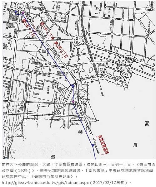 前往大正公園的路線,大致上從高雄縱貫道路,接開山町三丁目到一丁目。《臺南市區改正圖(1929)》。筆者另加註路名與路線。【圖片來源:中央研究院地理資訊科學研究專題中心,《臺南市百年歷史地圖》,http://gissrv4.sinica.edu.tw/gis/tainan.aspx(2017/02/17瀏覽)。