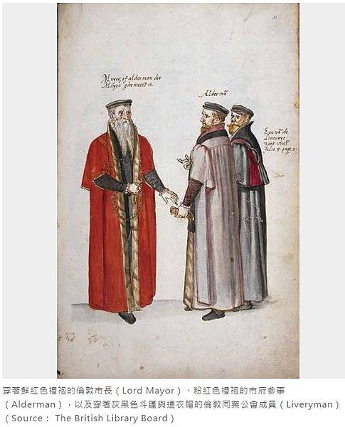 穿著鮮紅色禮袍的倫敦市長(Lord Mayor)、粉紅色禮袍的市府參事(Alderman),以及穿著灰黑色斗篷與連衣帽的倫敦同業公會成員(Liveryman)。(Source: The British Library Board)