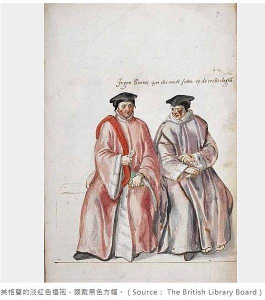 英格蘭的淡紅色禮袍,頭戴黑色方帽。(Source: The British Library Board)