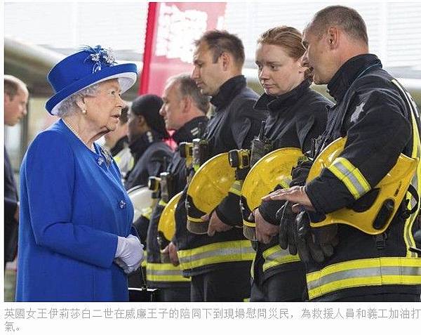 英國女王伊莉莎白二世在威廉王子的陪同下到現場慰問災民,為救援人員和義工加油打氣。