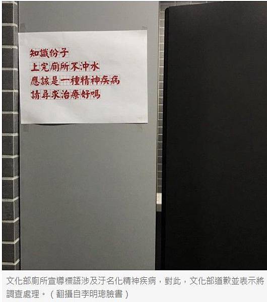 〔即時新聞/綜合報導〕台大教師李明璁今天(28日)在臉書上表示,文化部廁所宣導標語汙名化精神疾病,對此,文化部道歉並表示將調查處理。