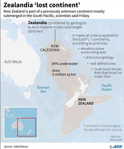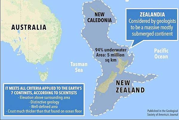 11名學者在美國地質學會(Geological Society of America)期刊《今日GSA》(GSA Today)發表研究報告《紐西蘭大陸:地球隱藏的大陸》(Zealandia: Earth's Hidden Continent)。他們指出,在澳洲東部的南太平洋海域,有一塊面積約490萬平方公里的完整大陸。這塊大陸名為紐西蘭大陸(Zealandia),面積約為澳洲大陸的54%,其94%的區域已被海水淹沒,只有紐西蘭、新喀里多尼亞(New Caledonia)和少許島嶼高於海平面。