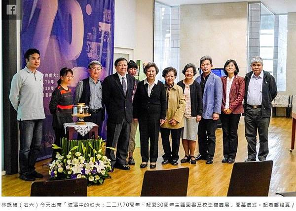 成功大學今天舉辦「波濤中的成大:二二八70周年、解嚴30周年主題圖書及校史檔案展」開幕儀式,特別邀請228受難者台大文學院前院長林茂生的女兒林詠梅出席,80歲的林詠梅看見父親銅像,情緒激動,她說,父親是個純樸的人,一心只想將學識傳遞給每個人,造福台灣,卻未料遭到如此迫害。