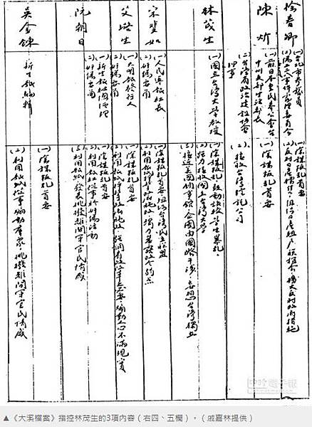 ▲《大溪檔案》指控林茂生的3項內容(右四、五欄)。(戚嘉林提供)