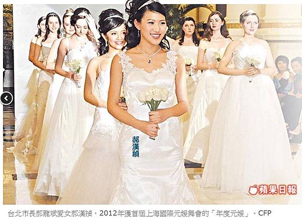 【綜合報導】台灣的名門千金紅到對岸了!前晚舉行的第三屆「上海國際元媛舞會」,有歐美與亞洲數國十幾位名媛與會,與男伴翩然起舞,結果富邦金董事長蔡明忠的長女蔡承穎獲選為「年度元媛」,是繼台北市長郝龍斌愛女郝漢禎於前年獲封之後,再有台灣名人千金獲此頭銜。