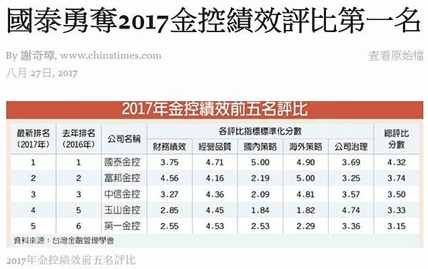 台灣金融管理學會等單位共同舉辦調查的金控公司經營績效評比,於日前公布結果,國泰金控獲頒2017年金控績效評比第一名,延續去(2016)年摘冠氣勢,再度奪得金控龍頭寶座。今年評比對象為國內16家金控公司,針對財務績效、經營品質、國內策略績效、海外策略績效以及公司治理五大面向作為評選指標。