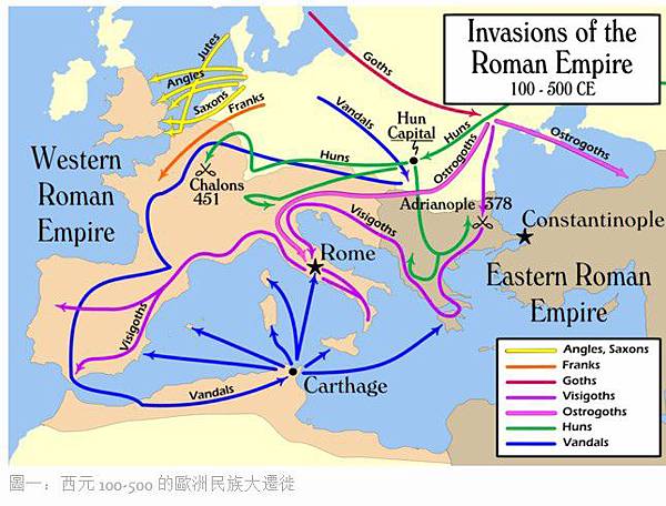 在第一世紀至第四世紀之間(羅馬帝國後期),匈族( Hun,至今難以確知是否為匈奴人)從東方入侵歐洲,而導致原居北歐的民族南遷:日耳曼人(東哥德人、西哥德人、汪達爾人、勃艮第人、倫巴底人、和法蘭克人)及斯拉夫人入侵歐洲,而導致羅馬帝國的滅亡,以及四百年的民族大遷徙。