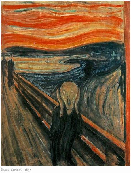 就像底下這一幅孟克(Edvard Munch,1863-1944)的名作〈吶喊〉,它既不美麗,也不寫實,簡直像是拙劣的漫畫。因為,作者想要表現的既非美麗,也不是一個人的外形、外貌,而是他內在的難以宣洩的焦慮、壓力、痛苦等難以用語言名狀的情緒。