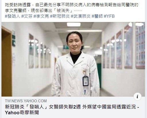 新冠肺炎「發哨人」女醫師失聯2週 外媒望中國當局透露近況 - Yahoo奇摩新聞 https://bit.ly/2XDoynY
