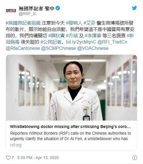 根據《美國之音》報導,10日無國界記者組織(Reporters Without Borders)聲明指出,中國武漢中心醫院急診科主任艾芬,至今已失聯2週、杳無音訊,該組織希望中國當局能趕緊透露艾芬的消息近況,美國聯邦通信委員會(FCC)共和黨委員卡爾( Brendan Carr)也在推特上連發9條推文狠酸中國外交部發言人華春螢,希望能見到包含艾芬在內,疑似「被消失」的8名「吹哨人」醫師、記者、教授等。
