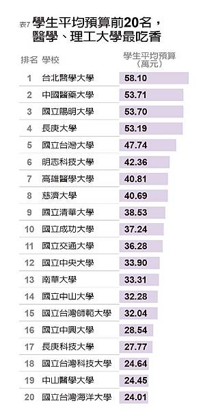 以排名前十強的大學,醫科學校就占比最多四所,分別是陽明、長庚、中醫大和北醫,而剛好這四所是全台學生平均預算最高的四強。
