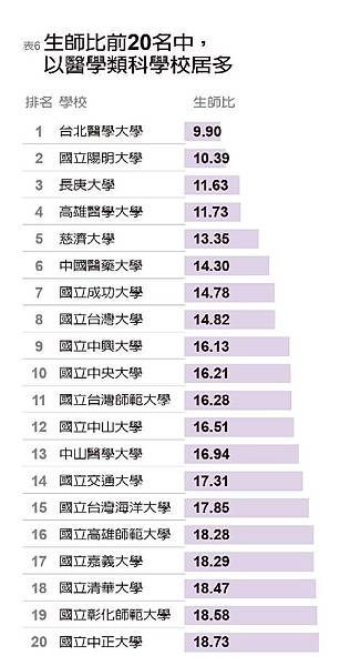 在台灣學術圈中,醫學院向來為王道,各大學積極設立醫學院或醫院,以增強競爭力。醫科類榜中,公立大學未占便宜,北醫、中醫大超越唯一的國立醫大——陽明,尤其北醫奪得醫科榜及私大榜雙料冠軍。該校「生師比」,每位老師僅教授9.53名學生,全台最優(表3)。