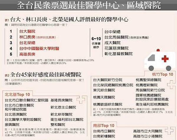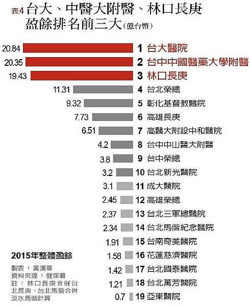 醫療院所結餘包括健保給付申請和自費醫療項目等醫務本業結餘,非醫務結餘則是停車場、美食街、股息股利等收入,兩者相加為整體結餘。整體結餘最高的賺錢醫院前五名,依序為林口長庚、高雄長庚、台大醫院、中國附醫、台北榮總。