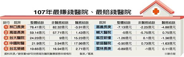 衛福部健保署近日於官網公布民國一○七年醫事服務機構財報,林口長庚醫院醫療本業大虧近四億元,但靠著股利等非醫務結餘八十二點三二億元,整體結餘七八點四一億元,蟬聯最賺錢醫院寶座;健保署將公布財報門檻由四億元降為兩億元,基層診所、藥局首度入列,遠東聯合診所盈餘達七九○○萬元居冠。