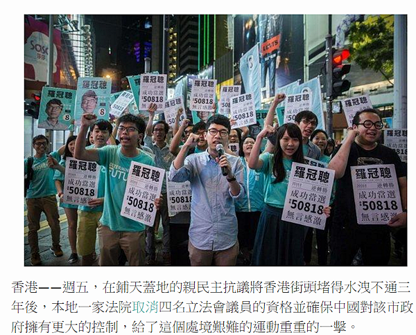二十歲的周可愛(譯音)表示,中國運動員在北京奧運橫掃獎牌榜,囊括四十八面金牌時,「心裡好興奮。我覺得中國好強盛,如果你那時問我,是不是中國人,我會說,我是」,但在參與二○一四年「雨傘運動」被捕後,「現在…我不想說我是中國人,這讓我感覺很差,即使你問我一百次,我也一樣不承認。」