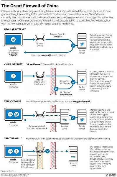 不過在最新的封鎖中,中國政府就再於當地伺服器中加上第二幅「城牆」,新的「城牆」不是封鎖海外伺服器,而是直接封鎖發訊號至 VPN 之中。新的「城牆」令大部分的 VPN 無法運作,而且由於「城牆」直接設於當地伺服器之中,能進一步監控智能手機等裝置。一圖看懂中國是如何封鎖 VPN! | Android 資訊雜誌 android-hk.com - https://goo.gl/gbxb5d