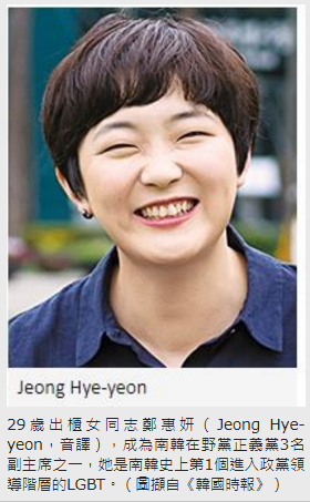 〔即時新聞/綜合報導〕南韓在野黨正義黨,最近選出3名副主席,當中包括29歲的出櫃女同志鄭惠妍(Jeong Hye-yeon,音譯),她是南韓史上第1個進入政黨領導階層的LGBT,她強調自己的目標是促進多元化,南韓LGBT團體則期待她能減少人們的偏見。
