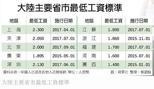 受到中國大陸整體經濟放緩與官方助力企業降成本政策影響,目前已有31省市先後公布今年最低工資標準的,增幅有所放慢。目前各省市,上海的最低工資標準最高,每月2,300元人民幣(下同);廣西、西藏則以1,400元並列最末。