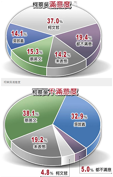 根據旺旺中時委託艾普羅進行的最新民調顯示,在蔡英文、吳敦義和柯文哲三人對比情況下,對蔡英文表現最滿意的民眾有15.3%,吳敦義獲得14.1%,柯文哲則有37%,滿意他的民眾高過蔡英文或者吳敦義兩倍以上;但是也有19.4%的受訪者對以上三位都表示都不滿意。