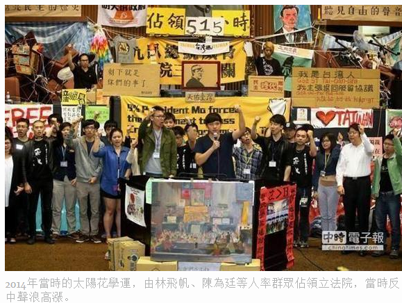 2014年當時的太陽花學運,由林飛帆、陳為廷等人率群眾佔領立法院,當時反中聲浪高漲。
