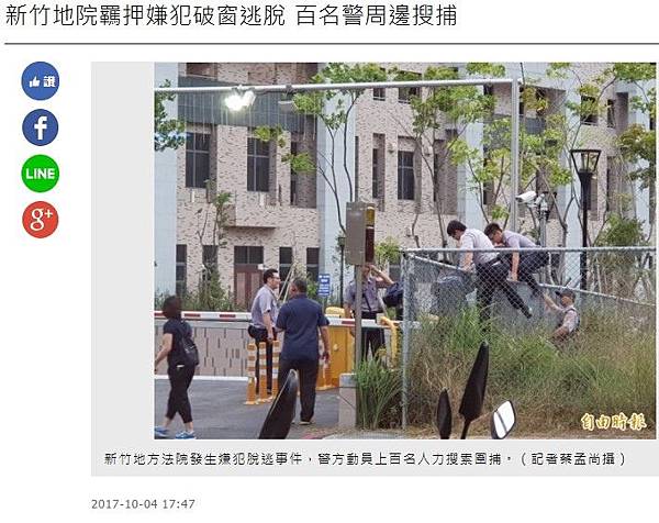 分享新竹地院羈押嫌犯破窗逃脫 百名警周邊搜捕到Facebook 分享新竹地院羈押嫌犯破窗逃脫 百名警周邊搜捕到Line 分享新竹地院羈押嫌犯破窗逃脫 百名警周邊搜捕到Google+