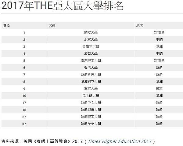 資料來源:英國《泰晤士高等教育》2017(Times Higher Education 2017)