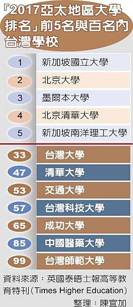 「2017亞太地區大學排名」前5名與百名內台灣學校