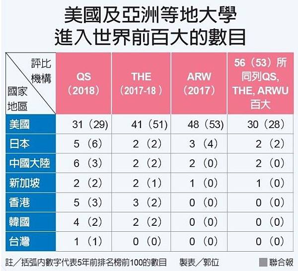 「QS世界大學」、「THE高等教育」及「ARWU學術」是國際普遍認可的大學教研評比。選用的指標不同,排名的結果可能有異,大學若是同時被各種不同的排名評入百大,可稱之卓越。附表列出美國及亞洲主要國家與地區分別及同時列入三種排名榜百大的數目。