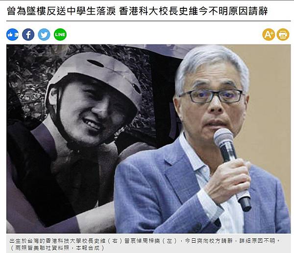 曾為墜樓反送中學生落淚 香港科大校長史維今不明原因請辭 - 國際 - 自由時報電子報