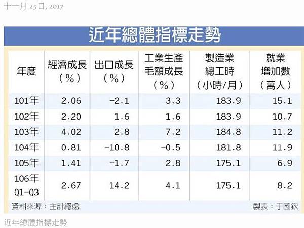 有些人也許已想到「一例一休」了,一例一休要求加班費加成發放,循此老板自然不想讓員工多加班,這才出現這個不一致的現象。此一論述看似有理,但生產、出口年增率都顯示生產熱絡,不循加班,那就得在正常工時裡多幹些活,無論如何既是景氣好,總工時(正常工時、加班工時之和)不可能比去年少,但統計顯示,今年前三季製造業平均每月工時175小時竟與去年相若,至於非農部門169小時,也和去年差不多。