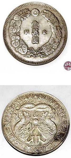 明治八年(1876年)日本天地十萬圓(或壹萬圓),柒兩貳錢的真幣,無論是造型或設計都是世界一流的,他的設計以天地為本,內圓圈有72粒珠,中間有三粒珠,其中有粒大珠,外圓(外援)有145條內橫線,他的背面也有145條內橫線,合計365,恰巧等於一年365天,除正面有雙龍含珠奪寶珠外,他的背面也有天和地,天上有太陽光芒萬仗,低上有萬物參葉茁壯成長。幣直徑8.7厘米,厚度0.65厘米, 面值拾萬圓(或壹萬圓),相當於當時的3780公斤的大銀圓,持此幣者不是一般人都能擁有,當時官位相當高,相當富的 https://goo.gl/jmKxZU