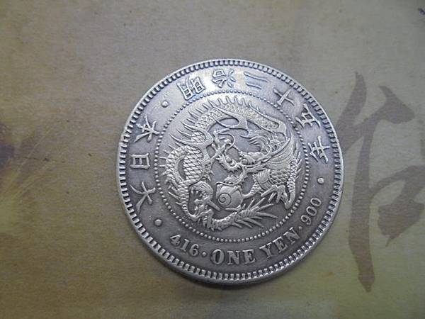您好:要說就說實話:這是約30年前臺灣民間大量製造的假幣.或者說是工藝品.當然這幾年有再翻鑄.日本政府當年無法發行如此大面額的龍銀.最大面額是二十圓金幣.一圓銀幣.以現在臺灣的總統府來說:是當年的總督府(大正年間).總造價不過280萬日幣.由此可知當時的物價非常平穩.何況是更早年的明治時期.