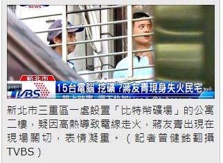 〔記者曾健銘、徐聖倫/新北報導〕新北市三重區中正北路一處公寓二樓十二日發生火警,消防人員趕抵,發現屋內是「比特幣礦場」,這處裝有十餘台電腦的機房,疑因二十四小時不斷電挖礦(運算),意外導致電線走火,特別的是,許久未露臉的「蔣家第四代」蔣友青昨下午突現身火場,與另名貌似工人的男子查看屋內毀損情況,外界猜測,蔣有可能是俗稱「礦工」的比特幣礦場投資者,才到場善後。