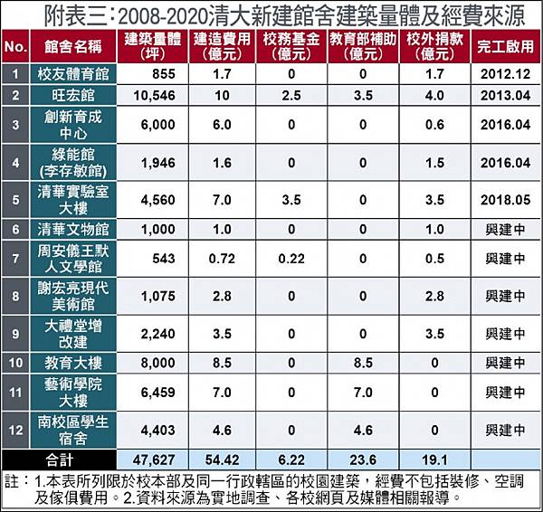 附表3:2008-2020清大新建館舍建築量體及經費來源