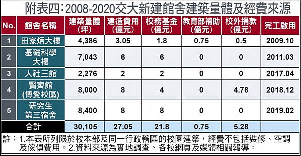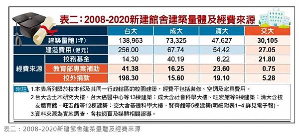 從二○○八年迄今,交大動用了校務基金超過二十億元於館舍的新建工程上。而台大、清大及成大等校則卯足全力積極募款及爭取教育部專案補助,新建工程的募款及專案補助款合計如下:交大六.○億元、清大四十二.七億元、成大三十一.八億元及台大二百三十九.七億元(表二),在四校之中,交大還是吊車尾。