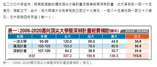 表一:2006-2020邁向頂尖大學暨深耕計畫經費補助(億元)