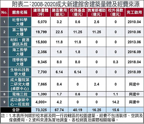 附表2:2008-2020成大新建館舍建築量體及經費來源