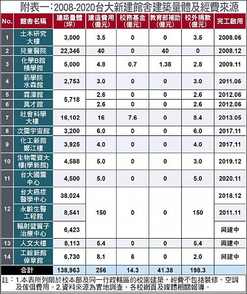 附表1:2008-2020台大新建館舍建築量體及經費來源