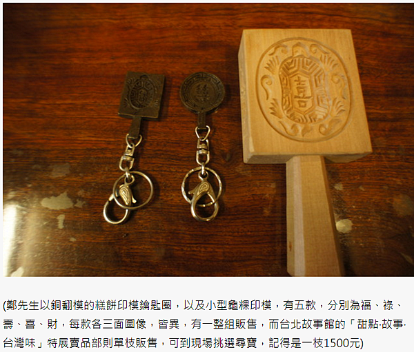 (鄭先生以銅翻模的糕餅印模鑰匙圈,以及小型龜粿印模,有五款,分別為福、祿、壽、喜、財,每款各三面圖像,皆異,有一整組販售,而台北故事館的「甜點‧故事‧台灣味」特展賣品部則單枝販售,可到現場挑選尋寶,記得是一枝1500元)